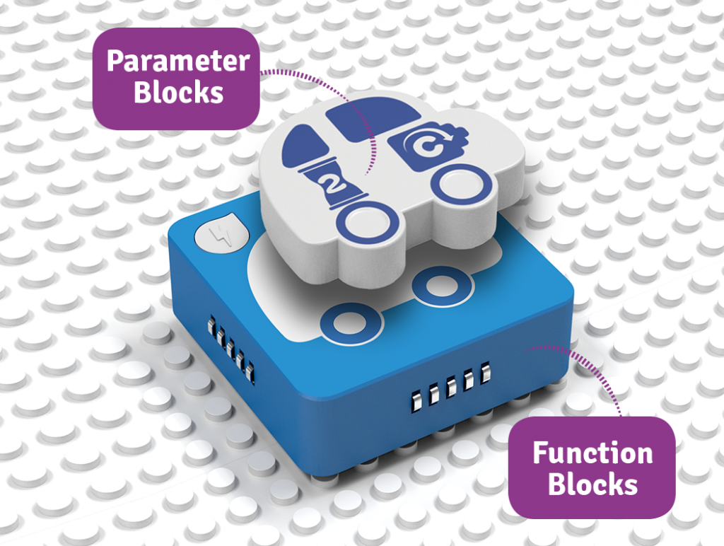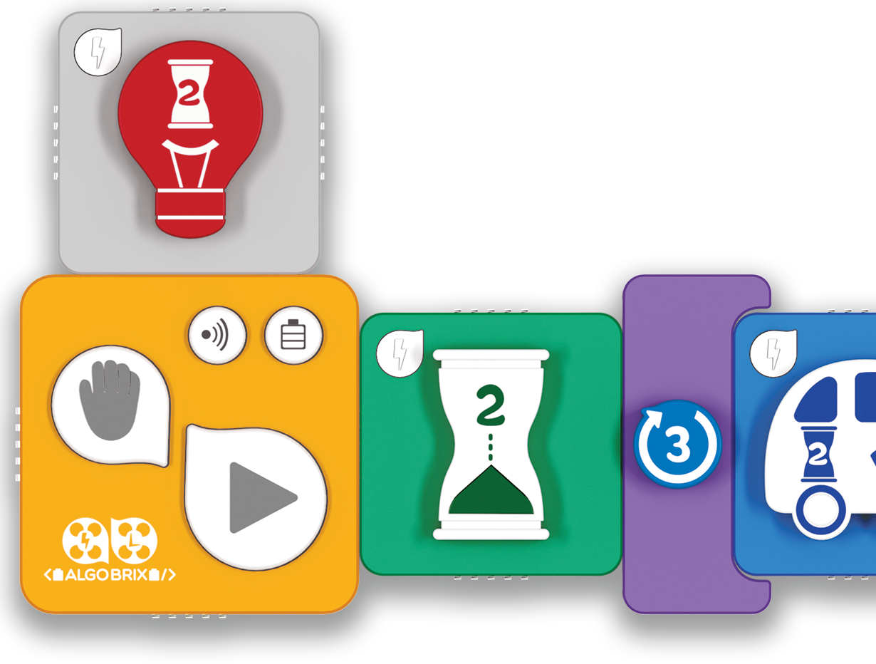 Con el lenguaje de programación interactivo de Algobrix®, los estudiantes comienzan construyendo un modelo en bloques de construcción, y luego crean varias secuencias de programación utilizando bloques de Función y Parámetro. Finalmente, al pulsar el bloque Play, el robot realizará la secuencia de programación creada.